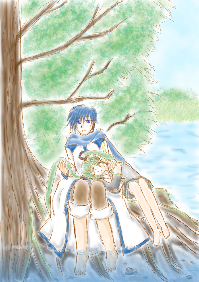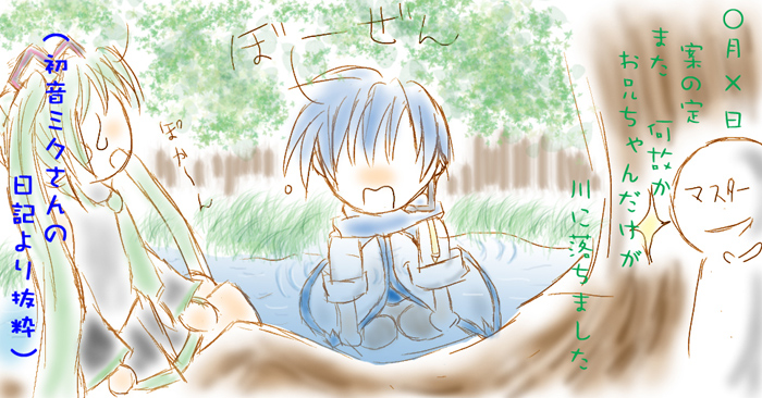 ふとしたはずみで、うっかり時間移動してしまった兄さんが、地元の少女に会って、兄さんの容姿(特に青い瞳)見て「隠れて!大人に見つかると捕まって殺されちゃうよ」とか、「それじゃあ、お兄ちゃんは『ニライカナイ』から来たんだね」「『ニライカナイ』?」とか、「あら?KAITO君、私のおばあちゃんの名前なんで知ってるの?」「え?マスターのお母さん、知ってるらっしゃるんですか?」とかそんな感じの話を考えたのは良いのですが、テーマがテーマなので重いし地元の方以外が軽々しく扱う(いや、軽く扱うつもりは毛頭無かったのですが)のもどうかと思いまして、没。で、絵だけが残りましたって感じです。でも、それを投稿用につけても見てる方も「???」なのでこうなりました。
