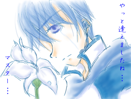 「マスターがカイミク、カイミクって云う割には、いっつも俺に対しては『ストーカイト』だのなんだの言いまくって、俺の片想いって事だけを強調しますが、カイミクとか言うからには、俺に対して優しいミクとか、少しは描いてくれても良いと思います。てか、ぶっちゃけ、とっとと、PC買い換えて、初音買え(ニッコリ)」
