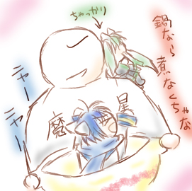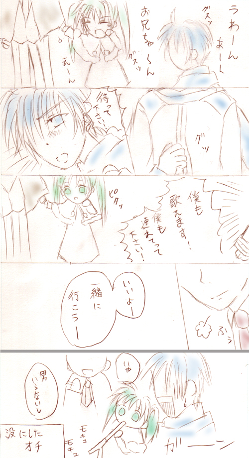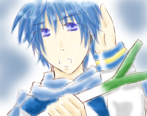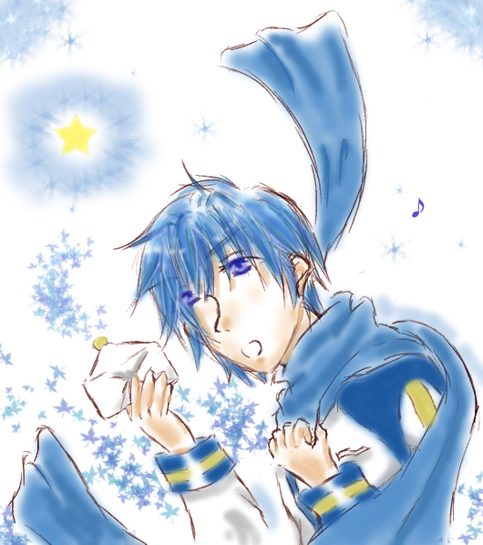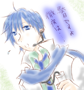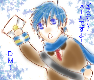 あれ?おかしいな。確か、「KAITO兄さんがいつも幼っぽく見えるから、少し大人っぽく格好良く描いて、尚且つ全身入る様に描く」って描き始めた筈なのに、何でいつも通りネタに走ってんだろ?しかも、最初の目標の微塵も達成してないし。あるぅえええ?って感じです。余りに鬼●な要求ばかりする魔星さんにキレたか、それともはたまた最初から卑怯なのかは御自由にお選び戴ければかとwそして、「おのれ、KAITOめ」か「KAITOは大変な物を盗んで行きました」のどちらにするべきか。……はい、本人的にはマスターの3の字目が描けて満足ですw後、未来の眼鏡なので伸縮自在ですw(描いてから小さい事に気付いた汗)てか、短足なの……(いかん、これ以上は墓穴掘る!)