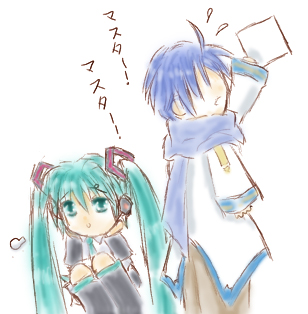 この絵はピアプロさんに初めて行った日の次の日にざかざか描いた絵です。まだ公式設定とか見てないから、ミクさんが異様に幼かったりして、フリーダムですみませんw
