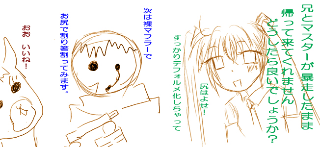 ミク「二人とも、一日中割り箸の話しかしないし、突然、読経みたいにブツブツ歌い始めるし、顔はすっかりデフォルメになっちゃったし、おまけに二人で割り箸全部食べちゃうから、毎日買い置きしておかなくっちゃならないんです。唯一止められる筈のKAIKOお姉ちゃんまで『わりばしの国を探しに行く』って、お家飛び出しちゃって。私どうしたら。KAITOさん……」