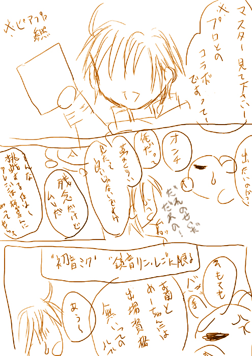 例のピアプロ様とプロさんのコラボ見てたら、兄さんが世迷い言(というか、このへっぽこマスターになにを期待するかwww)を言い始めたので、優しく諭してやったら、すっかりスネました↓